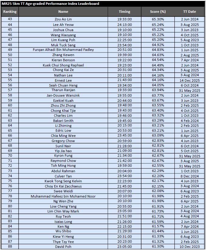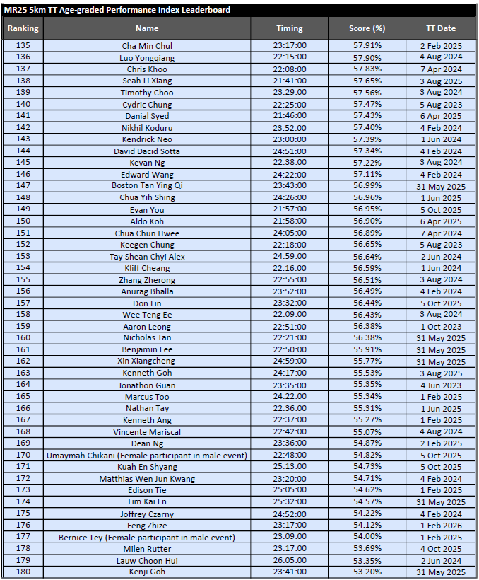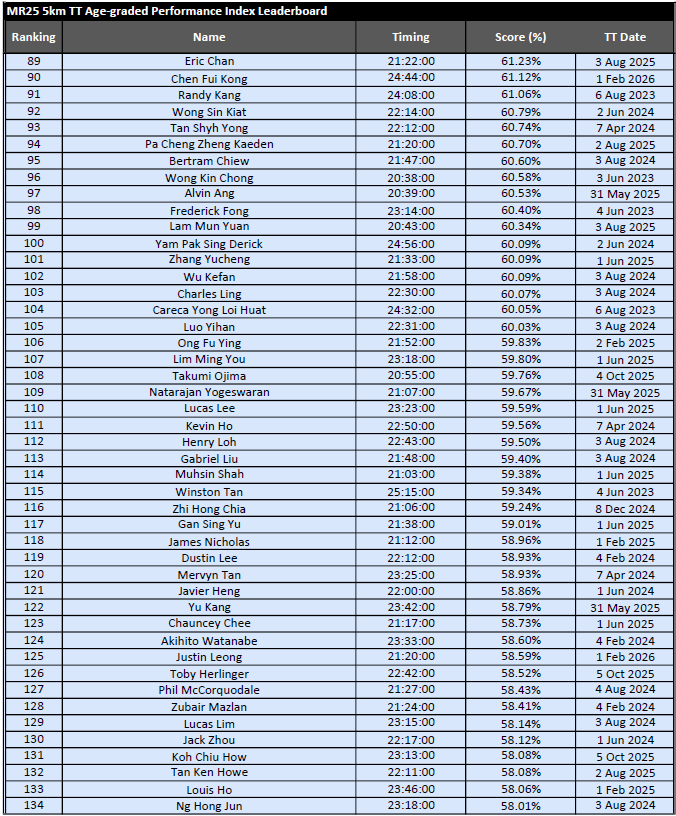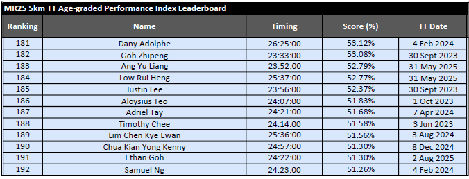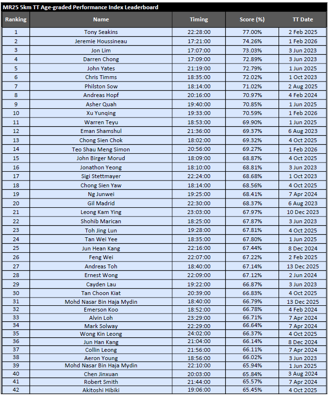 MR25 5km Time Trial Age-graded Performance Index (API) Leaderboard – February 2026