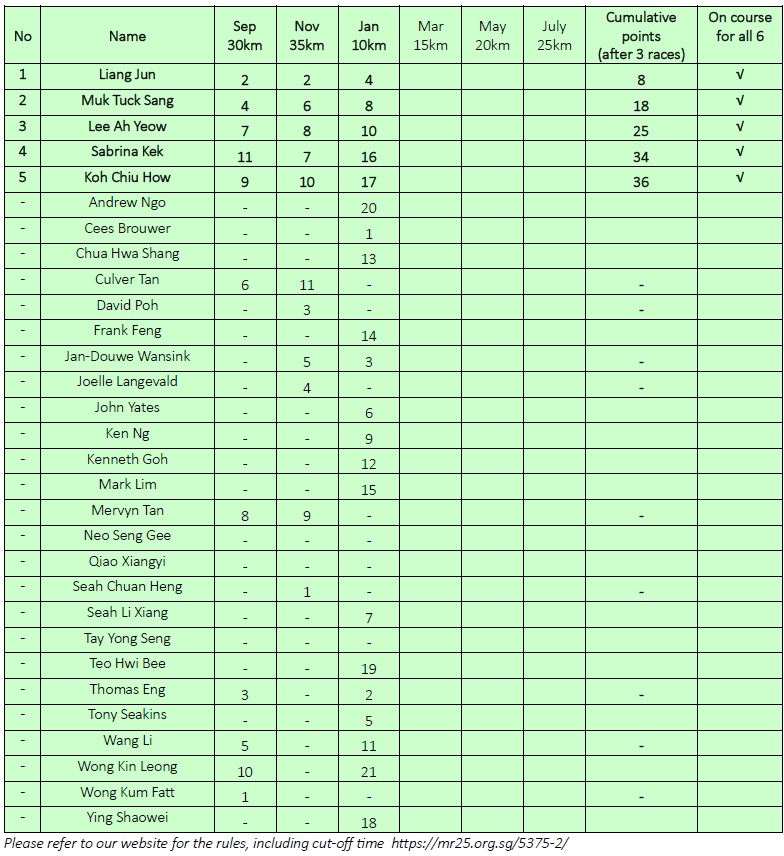 Here are the standings after the third run in January 26. Remember, you can join the series at any time. Completing all six runs earns you the Finisher Award, while the Top 10 participants with the lowest cumulative points (from best 4 attempts) will win the Winners’ Award.