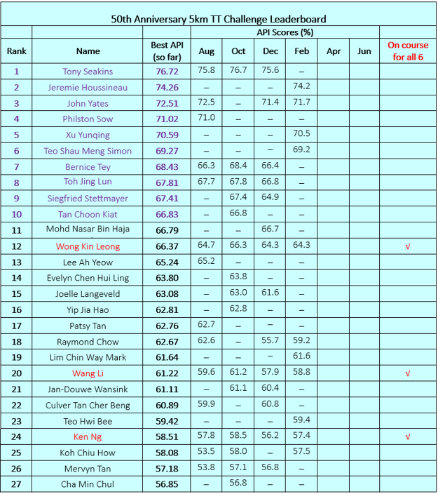 50th Anniversary 5km Time Trial Challenge Leaderboard (as of February 2026 Time Trial)