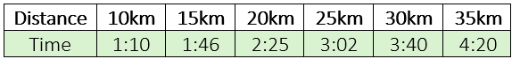 The cut-off times for the six distances are as follows: