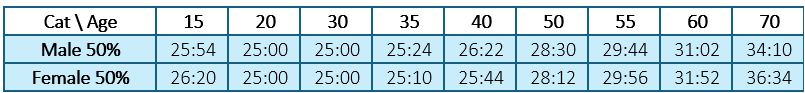 A sample of the 50% Age-Graded 5KM Standards (Time in min:sec)